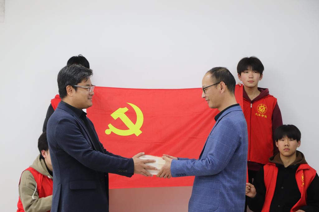 邱智铖代表信息工程系党支部向汽车工程系赠送党员学习材料。