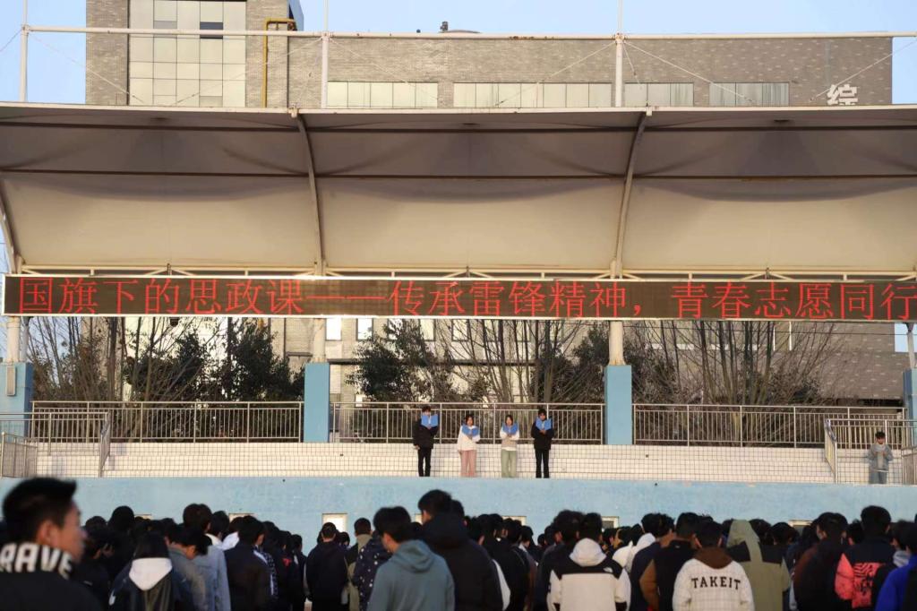 随着清晨的阳光,五星红旗缓缓升起,在升旗仪式后,信息工程系四名学生以雷锋主题表演精彩的朗诵,随后班主任代表王珊以“三月春风处处暖,青春当属志愿红”为题做演讲,激励同学们以雷锋为榜样,牢固树立志愿服务精神。