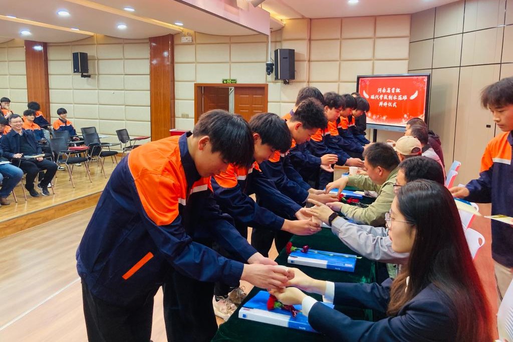在拜师仪式上,李力厚宣读现代学徒制试点师徒培养协议,尹亚波宣读示范班师徒结对名单,于庆斌为7名导师师傅颁发聘书。企业导师代表赵延坤、校内理论导师代表王潇倩、学徒班徒弟代表黑维祎分别发言。
