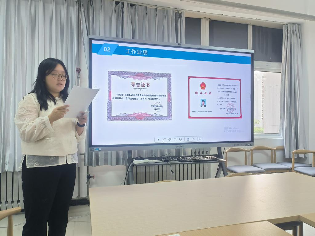 会上,合同制聘期已满的7名专任教师结合工作实际,从思想政治表现、教育教学工作业绩、承担部门工作和奖惩情况等方面进行述职汇报。大家通过一副副图片、一段段视频、一串串文字,不仅反映了与学校共同发展、共同进步的点滴瞬间,也传递着热爱教育、热爱学生的教育情怀。
