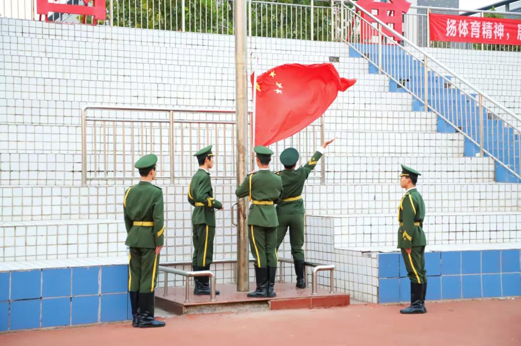 7点整,国旗护卫队迈着铿锵有力的步伐,护送国旗入场。伴随着《义勇军进行曲》,鲜艳的五星红旗冉冉升起,全体师生庄严肃立、高唱国歌。