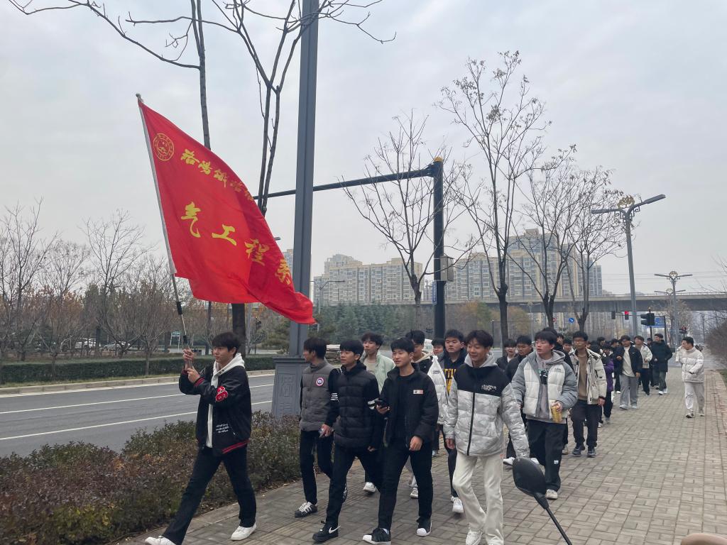 在徒步前往中共豫西特委梁村旧址的征途中,由党员教师张晨曦、马琳珊、杨凯丽及2024级电气1班和2024级电气4班学生组成的先锋队,高举系旗与象征“一二・九”精神的火炬,迈着坚定有力的步伐,不仅丈量着脚下的道路,更踏出了新时代青年对历史的敬重与传承的决心。