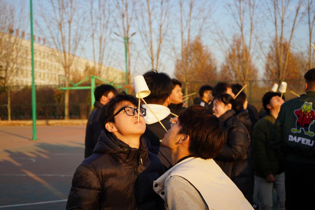 紧接着,“纸杯传情”游戏将现场气氛推向了高潮。学生需用嘴咬着筷子,巧妙地将纸杯传递给下一位同学,每一次纸杯的掉落都伴随着团队的鼓励与重来。这一过程中,学生们不仅锻炼了精细的沟通协作能力,更学会了在困境中保持冷静与耐心,有效管理个人情绪,共同迎接挑战。