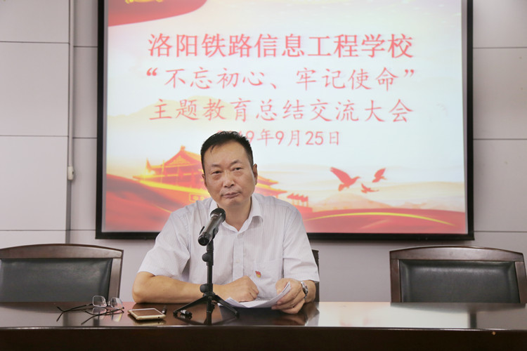9月25日下午,我校在1号实训楼2楼多功能报告厅召开“不忘初心、牢记使命”主题教育总结交流大会。全体党员参加会议。会议由校党委副书记、校长韩耀煌主持。