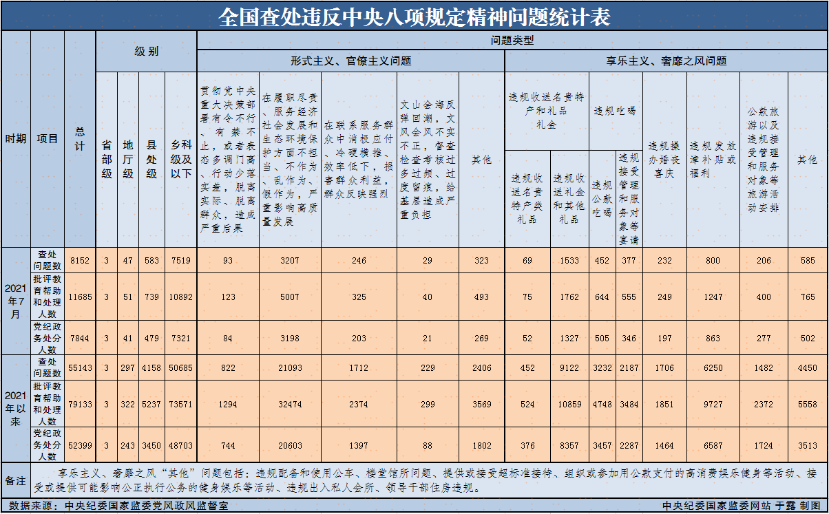 2021年7月全国查处违反中央八项规定精神问题8152起